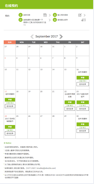 6) 會顯示預約用的月曆和步驟簡介,找你需要的日期再按該日的”申請”,留意的是此班車只在每星期的五六日(共3天)才運行,以及每天只有41個名額,每個日子會括號顯票已成功申請的人數,若果顯示 41/41的話就代表當日申請已滿,那只好選擇其他日子