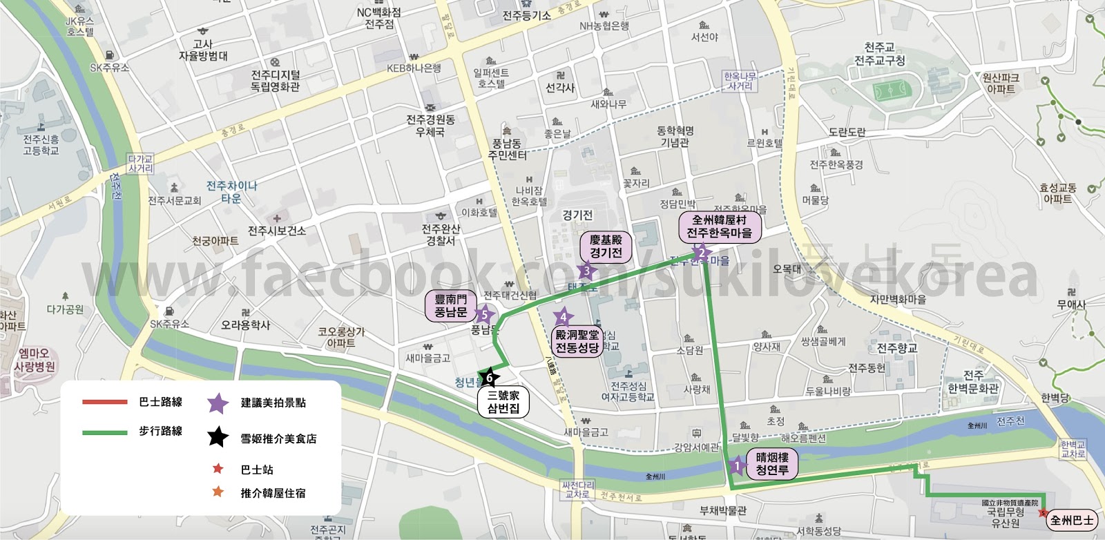 建於全州韓屋村外圍橫跨全州川的石橋上,大家可以在晴烟樓的內稍作休息,同時欣賞一下全州川寧靜而清優的河畔景緻。作息過後再走到全州韓屋村逛。