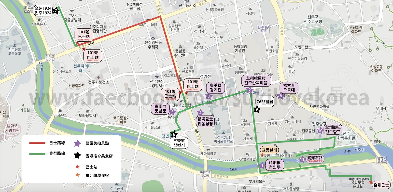 以前到全州由大家可以申請免費的全羅北道班車,現在雖然仍舊有此巴士,但已改為收費服務,費用也不算昂貴,加上是直通車又有導遊跟車, 雖然大家亦可以自行乘搭長途巴士或鐵路去全州,但要到全州韓屋村就要再轉車,這樣比較不方便和昂貴,若果大家不懂韓文,雪姬還是建議大家乘搭此班車。