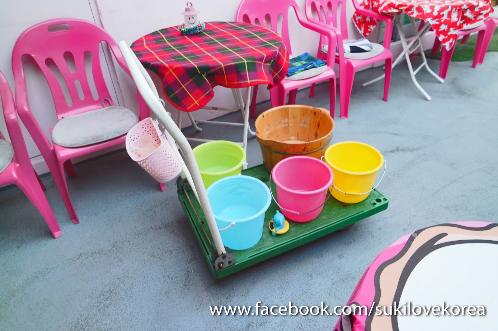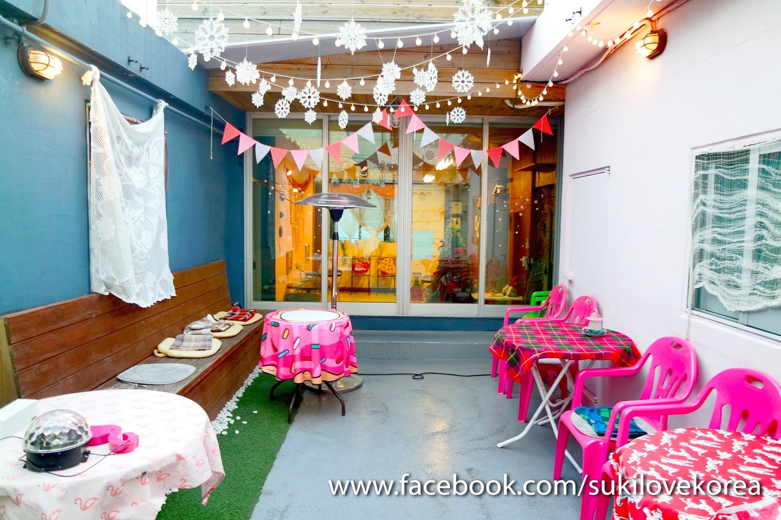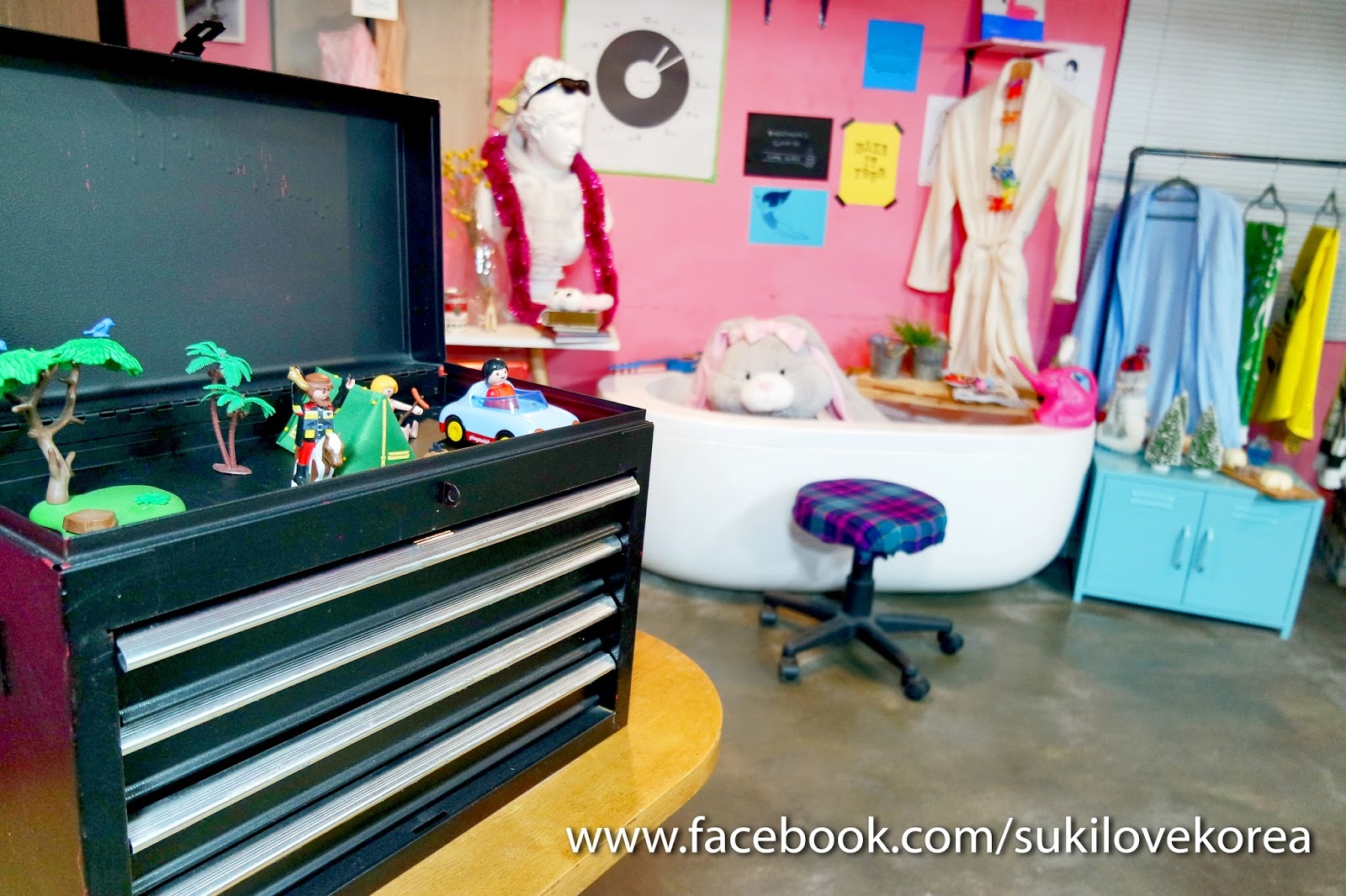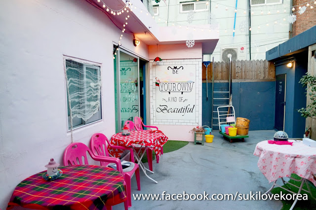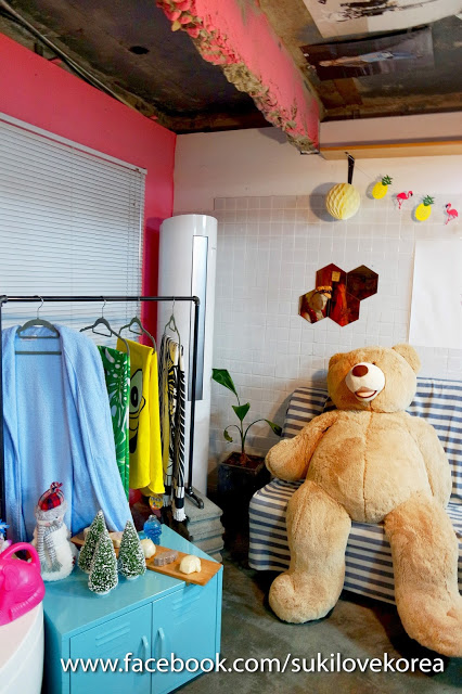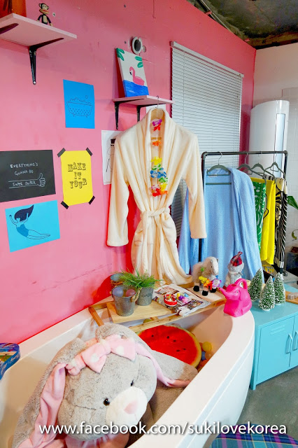 這裡有是一個天台樓房,外面就是泡的地方,走進室會看到韓妹必定打卡的位置,以粉紅為主調擺放著多種得意趣致玩具和娃娃佈置而成的可愛浴室場景,還有特大熊bear bear可以抱著拍照一翻!