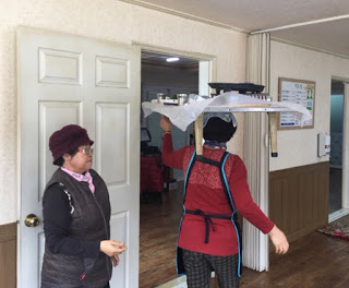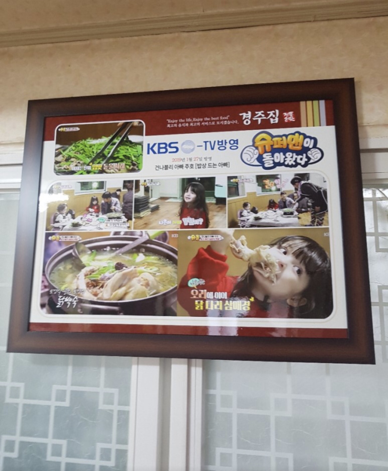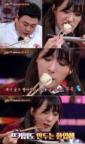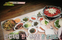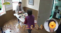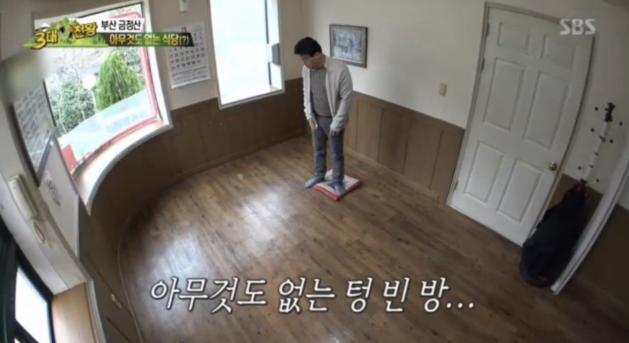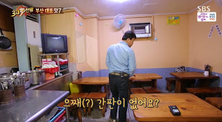 美食店的特色是一進店內一張桌都沒有擺好!因為他們會隨客人選擇位置後,再把用餐的小餐桌抬過來, 而這裡店員的絕技是。。。 頭頂餐桌送餐!這個動作就連白鐘元看到時都嚇到了,立馬幫忙搬桌!