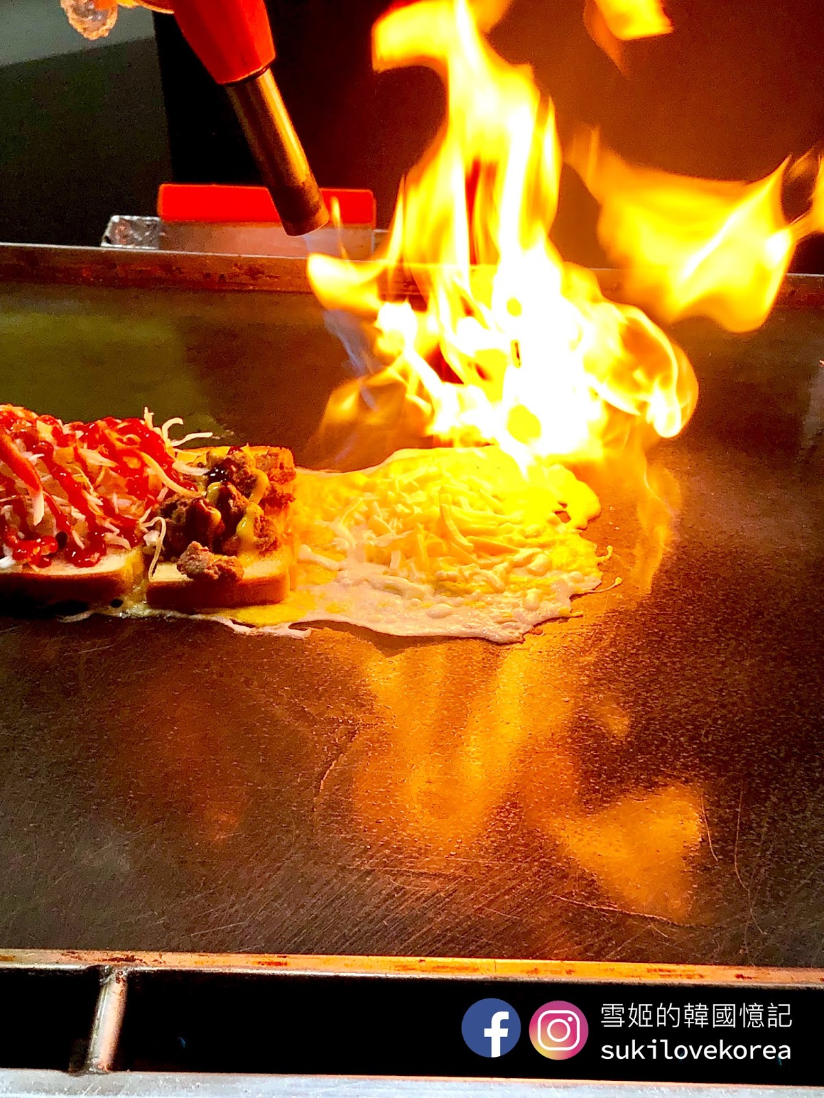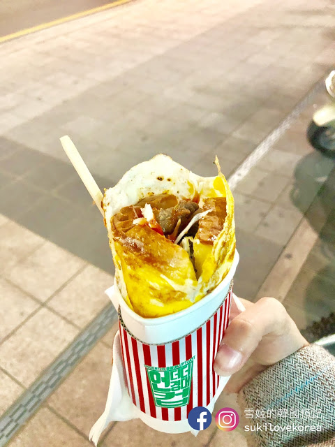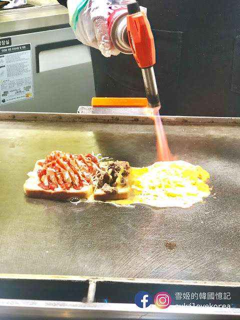 選好口味店員便會在你面前製作吐司,來個招牌경대컵토스트吧, 這款吐司有火烤牛肉做配料, 店員在鐵板上烤炒牛肉後, 把吐司配料加上醬料後, 便在吐司旁煎一片大大片的蛋皮再加起司, 要起司有拉絲效果當然要用火槍燒溶,火溶起司跟蛋皮混合起來, 最後卷著烤牛肉吐司再放進杯內便完成,真的又可以吃又可以看表演呢!