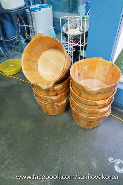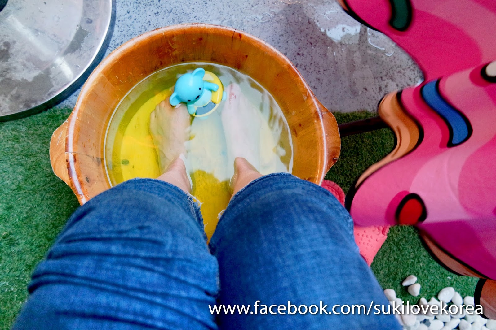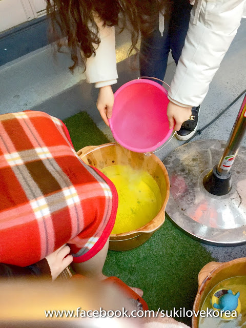 足浴劑有兩種味道供選擇,包含lemon-檸檬和jasmine-茉莉, 選好味道店員便會為客人倒入浴劑和可愛動物造形的計時器進浴桶中,大家只需要把腳放進去便可以開始了!記得要脫子和把長褲的褲腳捲起來,不然就像雪姬一樣忘記了,差點直接把腳放進去(雪姬當日在生病中。。。不太清醒沒辦法)。以下是泡腳現場短片: 我們當天走了很多景點,早上去了梵魚寺,中午去了甘川洞文化村,走路走到超累,回到南浦洞就直接跑來泡腳了!天氣超冷在天台泡著溫暖的腳超relax。。。但我們泡不到5-8分鐘水便很快冷了,店員都自動備好熱水當我們覺得冷時便及時注入熱水。。。泡腳的這20分鐘內,因為天氣太冷,店員總共為我們注了3次熱水!真是辛苦她了!