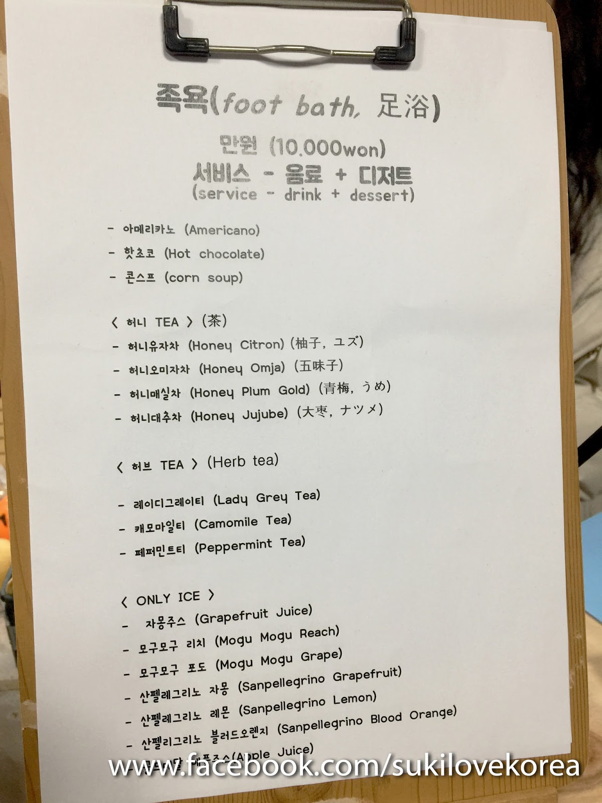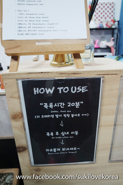 這裡是以套餐形式收費,11won就包含了20分鐘足浴+1杯飲料(可選咖啡、花茶或養生茶,還有凍熱飲可選)+ 1份甜點(是日甜點不供選擇),