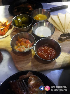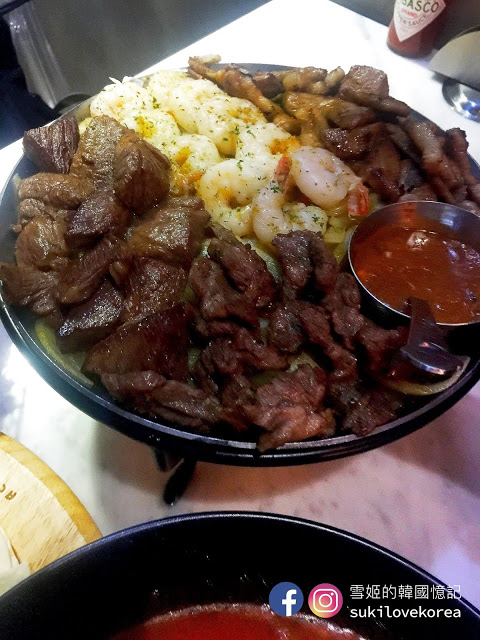 墨西哥烤肉拼盤主要以牛肉跟蝦為主,大家用墨西薄餅夾著烤肉沾上各種醬料來吃, 兩人一個烤肉拼盤超大份量, 拼盤還會配上法式麵包, 絕對要空著肚子才去吃!