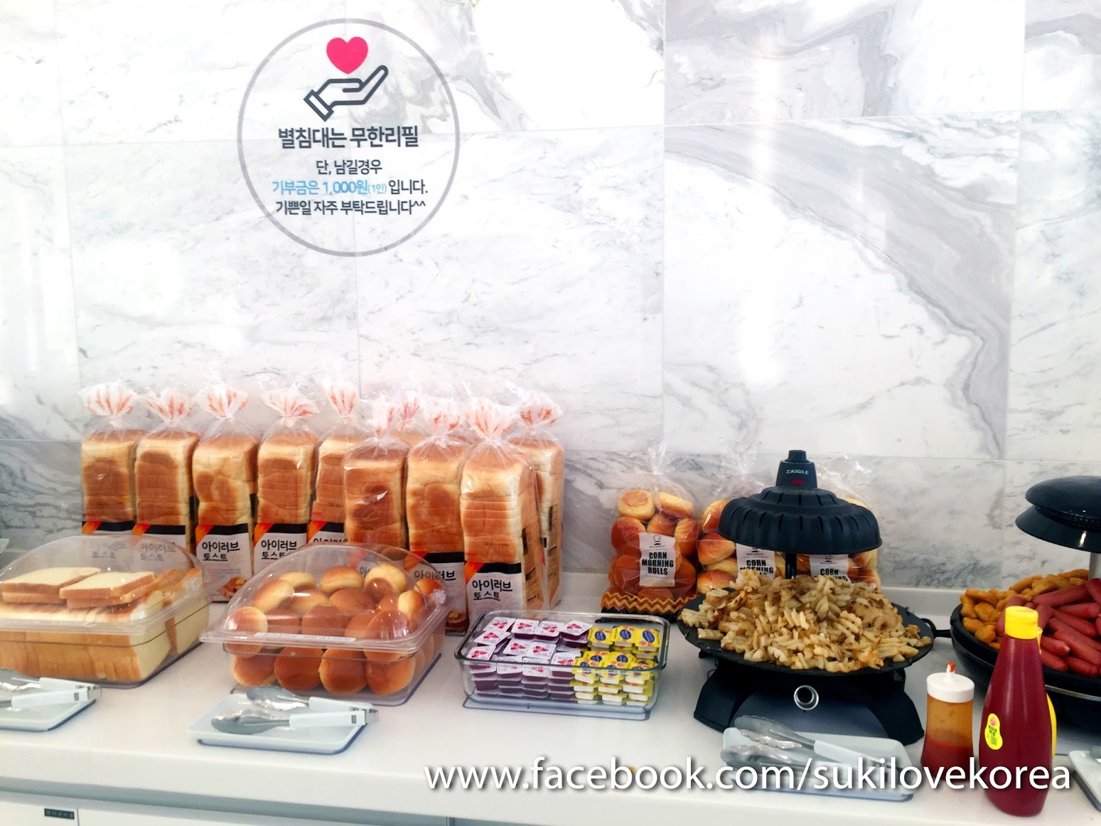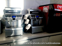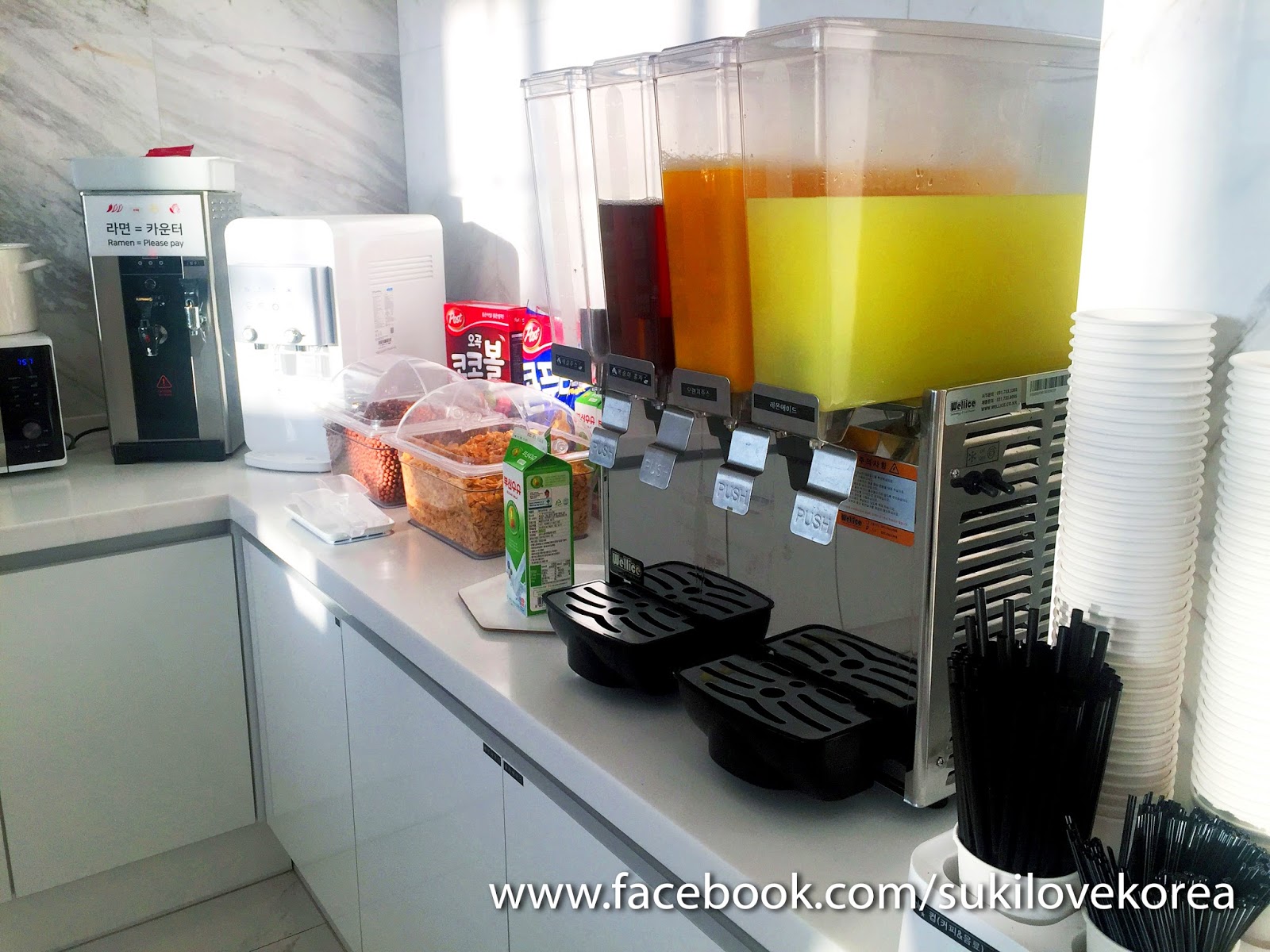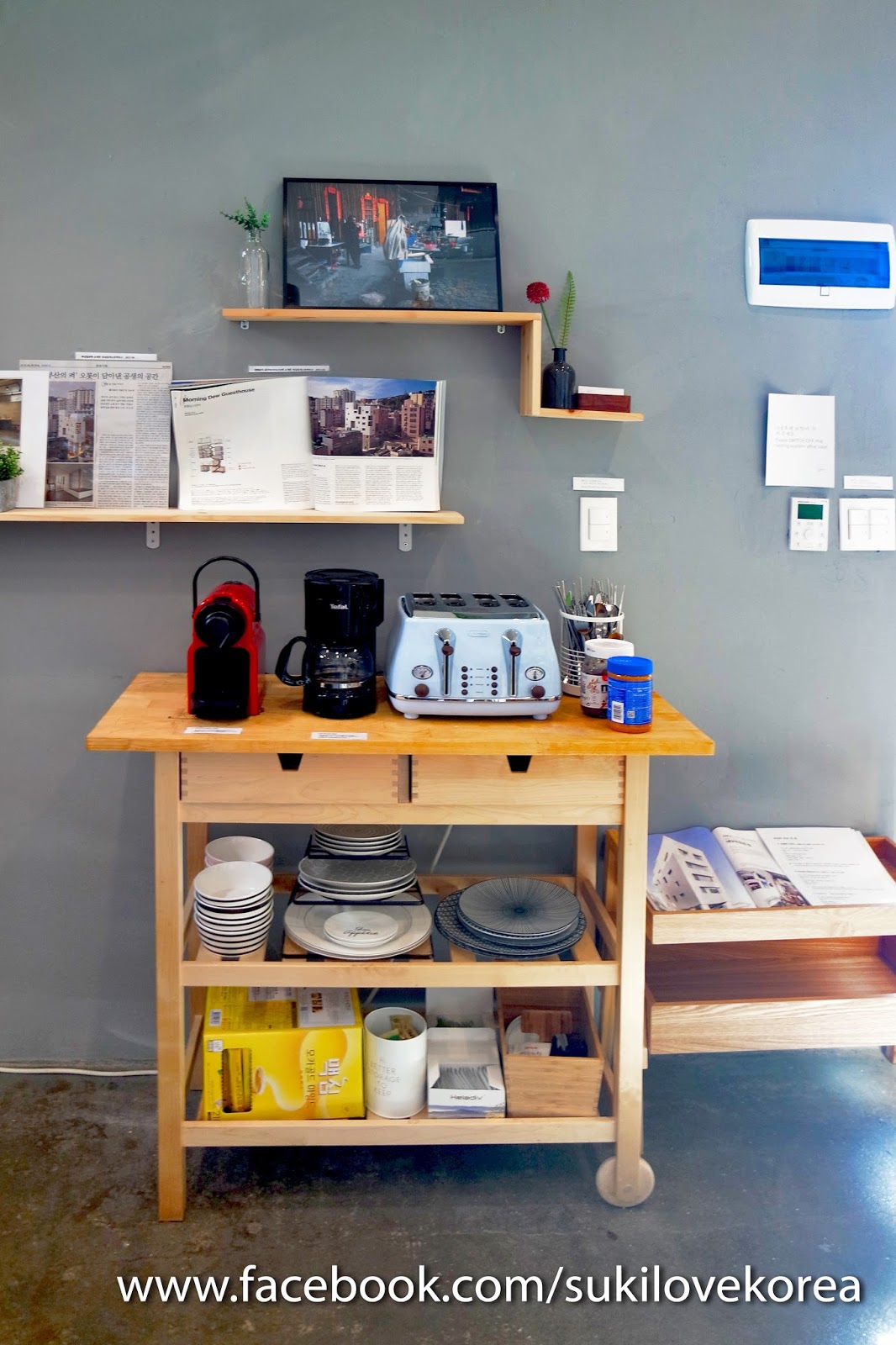 先來介紹一下1-2層的特式咖啡店吧!這裡的賣點是無敵廣安大橋海景,中午11時開始營業至零晨1時(周末零晨3點),不論是房客或是只用咖啡店的客人只要付9000won入場費,就可以在店內自由的享受4小時,這裡沒有店員為你倒咖啡捧食物,有的是一個設在1層的自助餐飲區,入場費以包含了使用自助餐飲區的費用,客人可以自行在這裡拿你想吃想喝的,食物方面都是一些普通的零食或小點心三明治之類,飲料方面,剛是一般的汽水果汁,另外亦有提供星巴克咖啡豆,客人可自行做咖啡來喝,