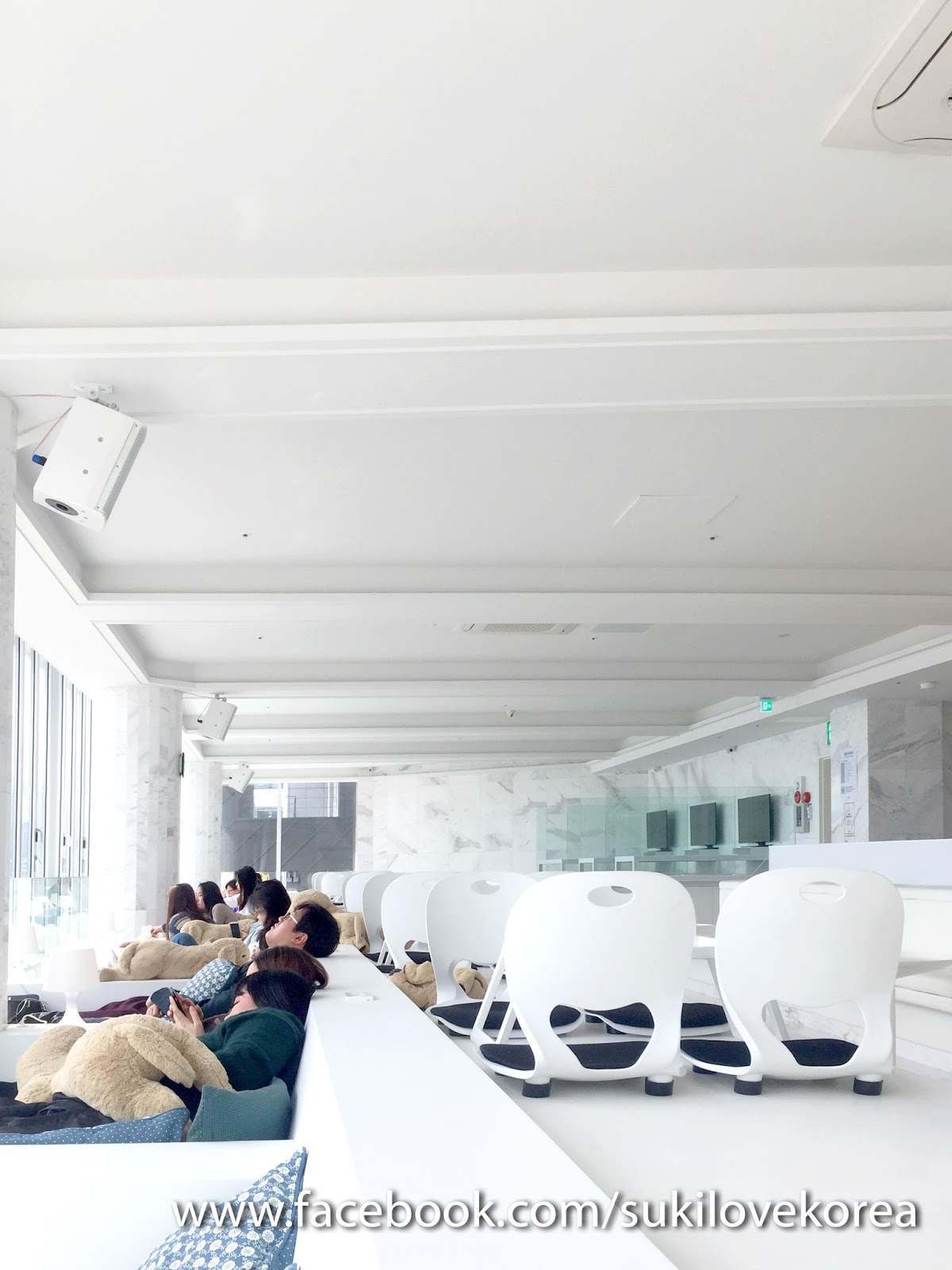 怎知。。。坐了不久,兩旁床位都有韓國年輕情侶坐下,shit……大家都知道韓國小情侶的放閃程度是何等旁若無人吧!夾在中間的我,雖然渴睡但也不敵他們的閃光彈。。。閃盲我了!除了床位,當然亦有普通的椅子或塌塌米座位及階梯座位等。而且兩層還設有幾個獨立淋浴間,咖啡店的客人在付費的4小時內可以使用,