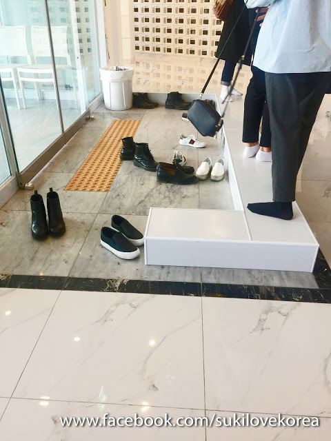 每個進入酒店大門的客人無論是只來咖啡店或是房客,只要一踏進正門都需要立即在指定範圍內脫下鞋子,然後職員會指示客人到旁邊的儲物櫃把鞋子鎖上(每個儲鞋櫃都設有電子密碼鎖,密碼都是客人自行設定的),其實形式跟平常去汗蒸幕換衣服前要鎖鞋子是一樣的!所以在整間酒店內走來走去都是光著腳的,穿襪子當然沒問題啦!