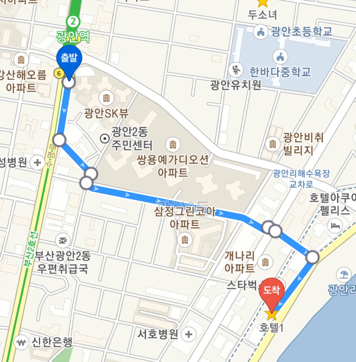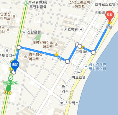 另一個地鐵站是廣安站5號出口會有升降機,走路到酒店大概要20分鐘以上,超遠!!!絕不建議大家走這個站。因為兩個站我們都刻意走過了,大家最後都認為金蓮山站是最近的!