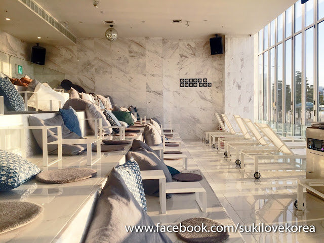 2層則是房客專用的位置,2層是最多韓國情侶來打卡的,因為2層的無敵落地玻璃窗口的旁第一排的座位,設有7-8個大床設計的座位,韓國情侶最愛躺在床上一邊欣賞廣安美景一邊自拍一邊談情。。。。雪姬去的那天,因為時間還早,所以可以佔用了一個大床位置打算小睡休息,