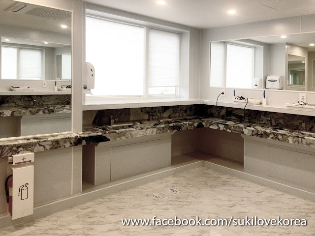 這裡是個很大的公共空間有每幅牆都是大大的鏡子,刷牙洗臉更衣吹頭都在這裡,