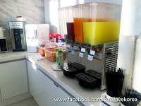 拿好想吃的就可以捧回自己的座位慢慢享用,自助餐飲區是4小時內無限次任用的。而有訂早餐的房客,早上7點半至10點都是在這裡享用自助式的早餐,以下是早餐時的自助餐飲區照片。
