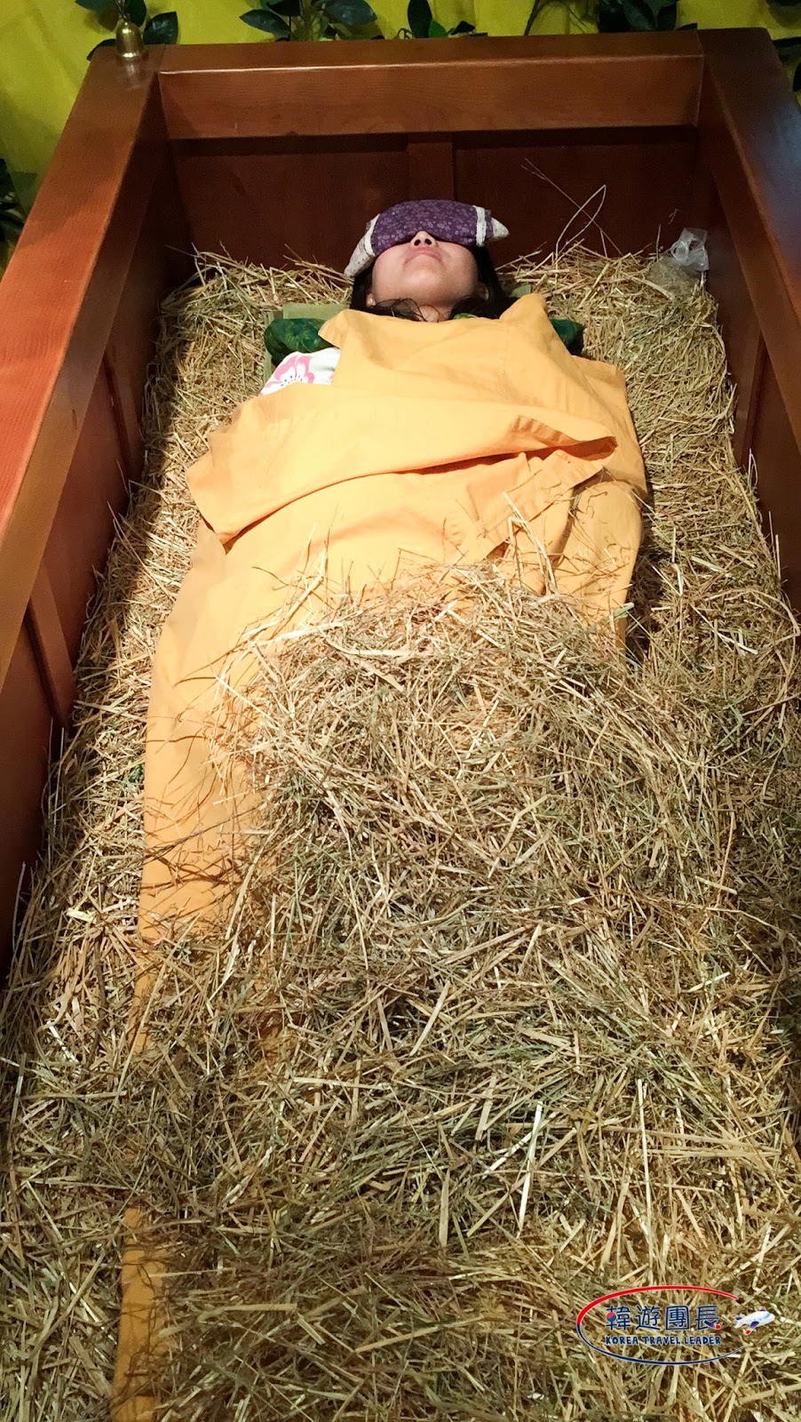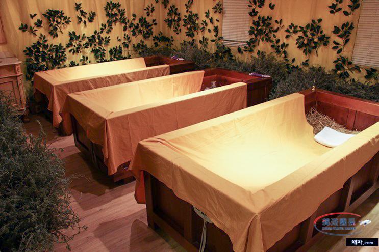 浸浴完後穿回浴衣便到另一個房間進行香草乾草的薰蒸了,一個個木製的大木箱箱內放了很多乾草,客人躺進去後,美容師會為客人蓋上薰衣草眼罩,然後再用乾草舖蓋全身進行薰蒸以達至排毒效果,
