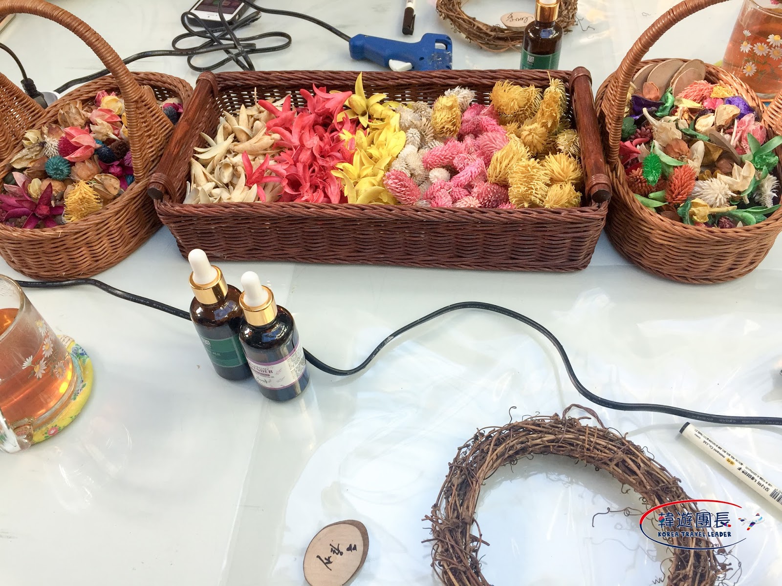 同樣在香草療養中心內,大家要以預約其diy手作班,使用在薰衣草岛乐园亲自收获的香草來制作出自己亲自设计的香草花环,整個過程是一小時,導師會準備一籃籃的乾花和基本花圈供參加者使用併砌出自己獨有的花環,