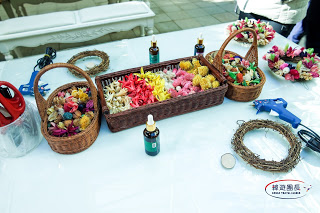 大家只需以熱溶膠貼上乾花在基本花圈上便可,絕對不難製作,我們4個人在整個製作過程中都超級投入,低頭不發一聲的不停貼貼貼。。。貼完後導師會為其花環滴上香薰便成了!