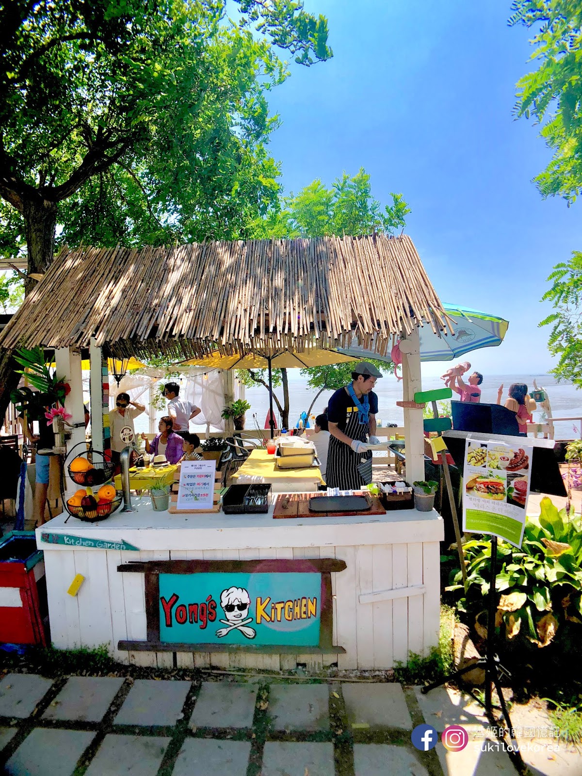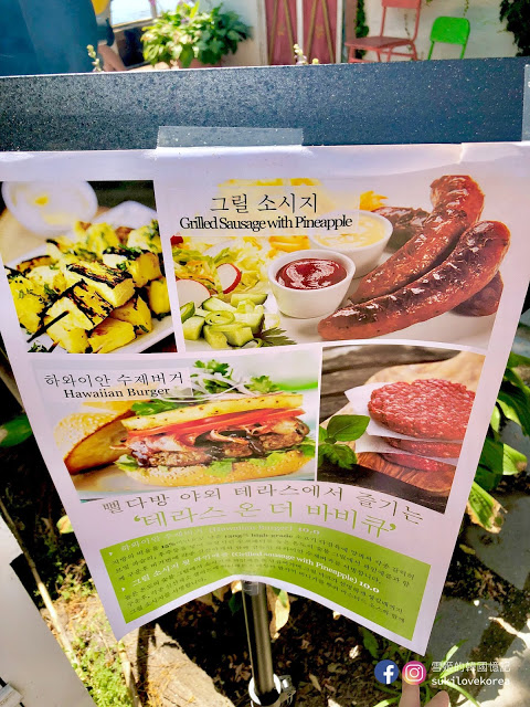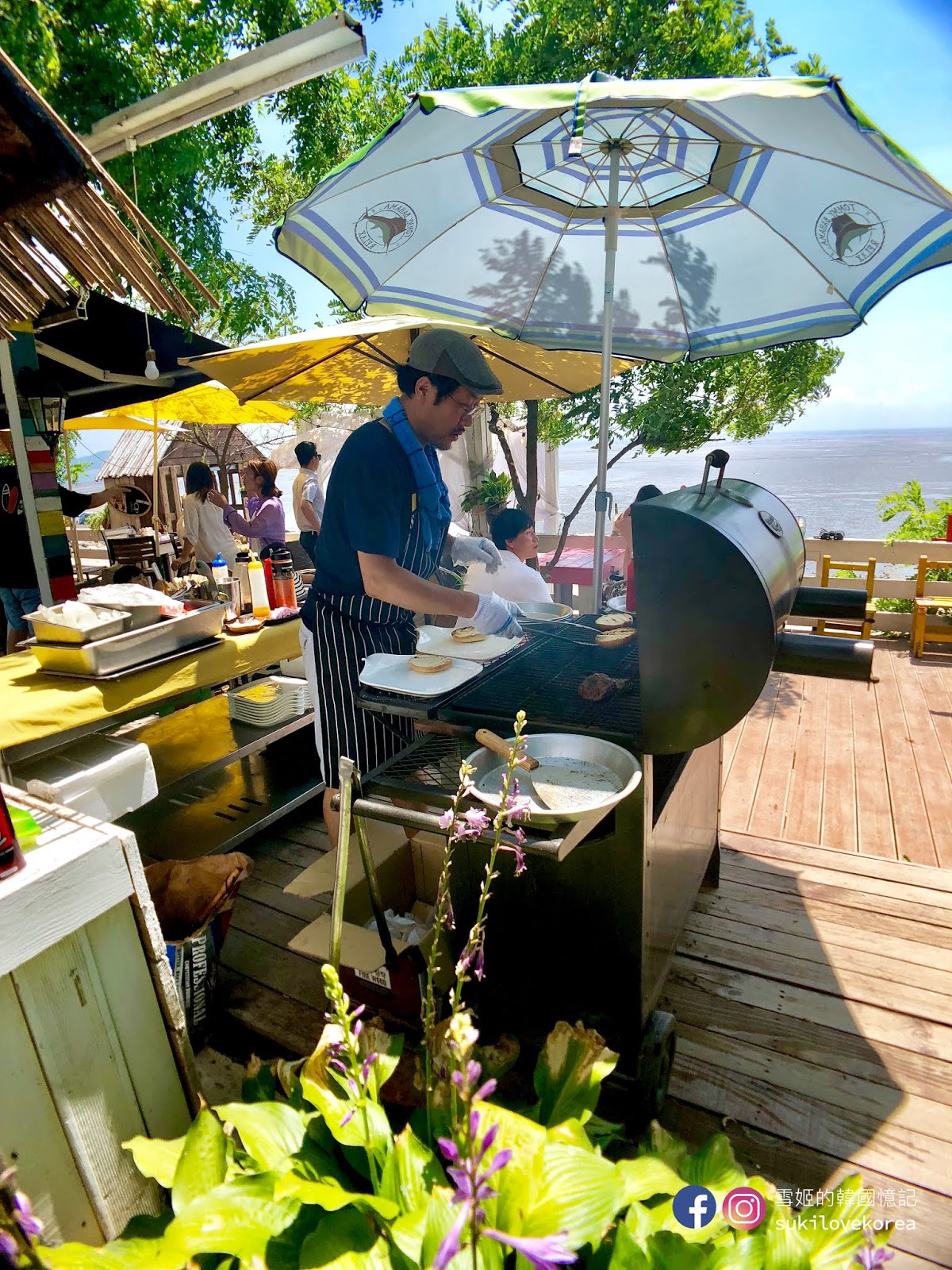 偽《尹食堂》招牌其實是『龍』食堂才對,它的正身本店名叫MUD CAFÉ (泥灘咖啡店),位於停車處旁的右邊走幾步路就到,而偽《尹食堂》招牌就在露天坐位的旁邊,它是『龍食堂』美食亭,這裡專賣燒烤美食,而最為人氣的是夏威夷漢保飽,大廚就在美食亭燒烤著各類食材,然後因為會突然很多人在下單點菜,所以拍照時就要看準時機了!