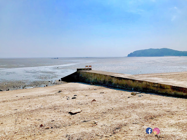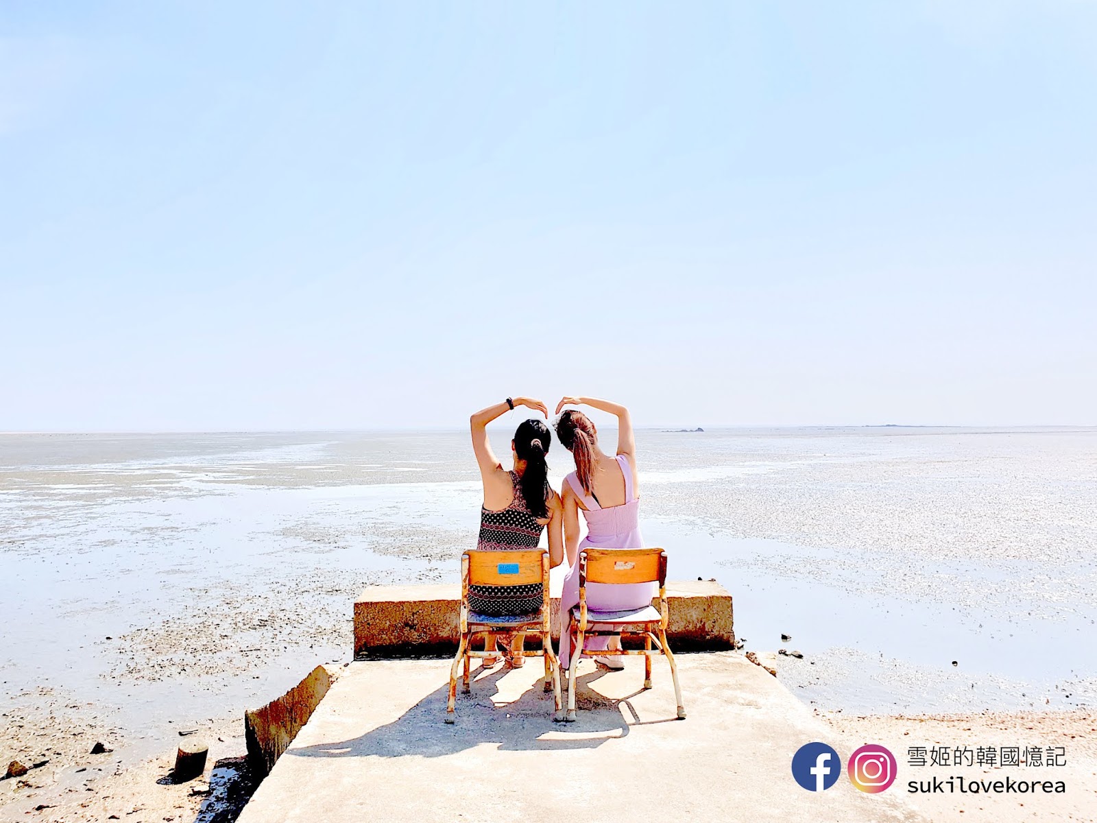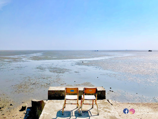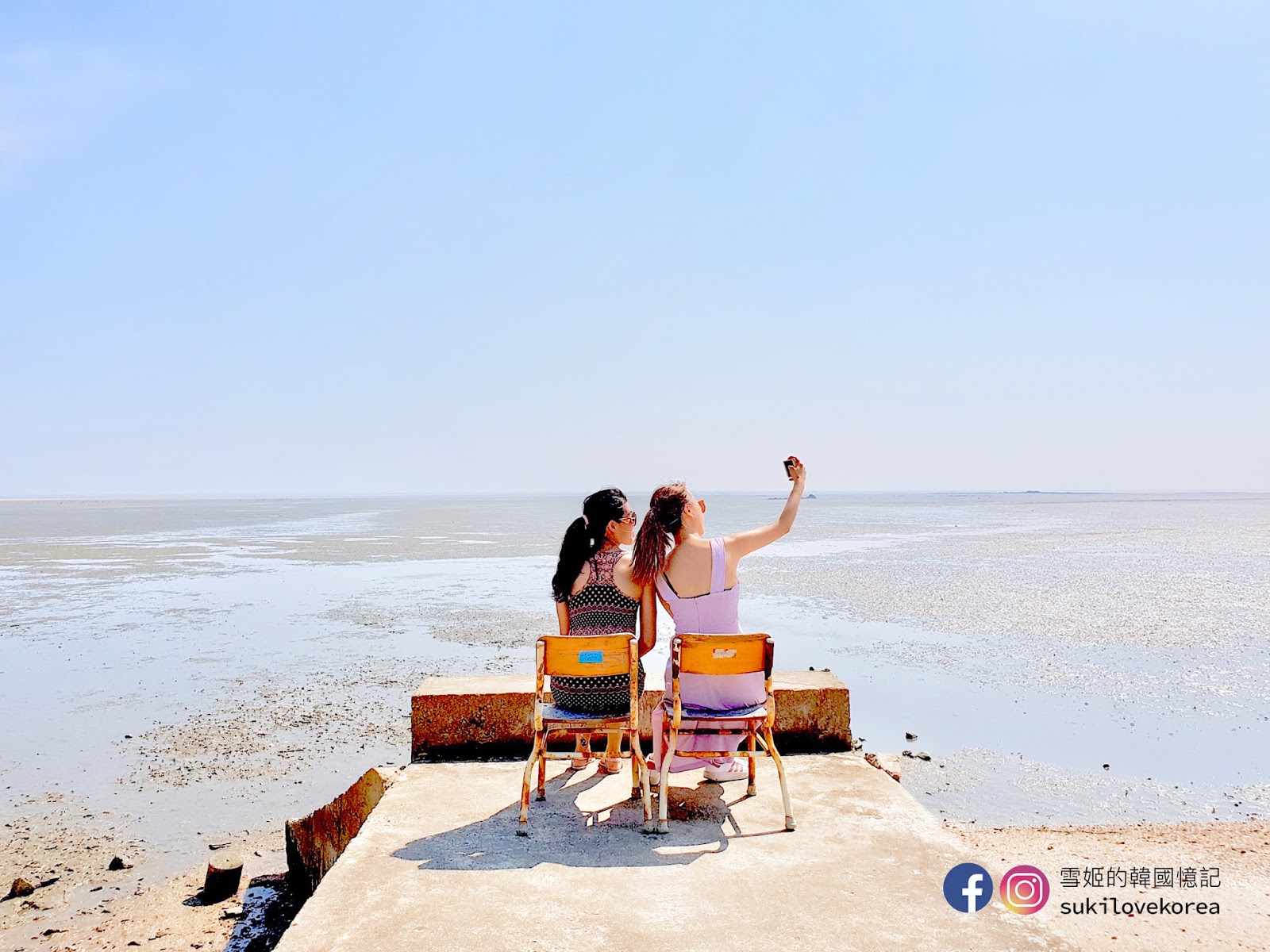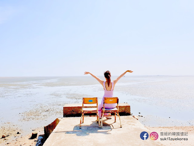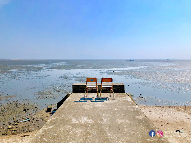 面向泥灘的右方不遠處還有一條小的堤道,上面亦放了兩張椅子,大家亦來這裡拍一下!韓妹們最愛之一簡潔的天空海洋背景!