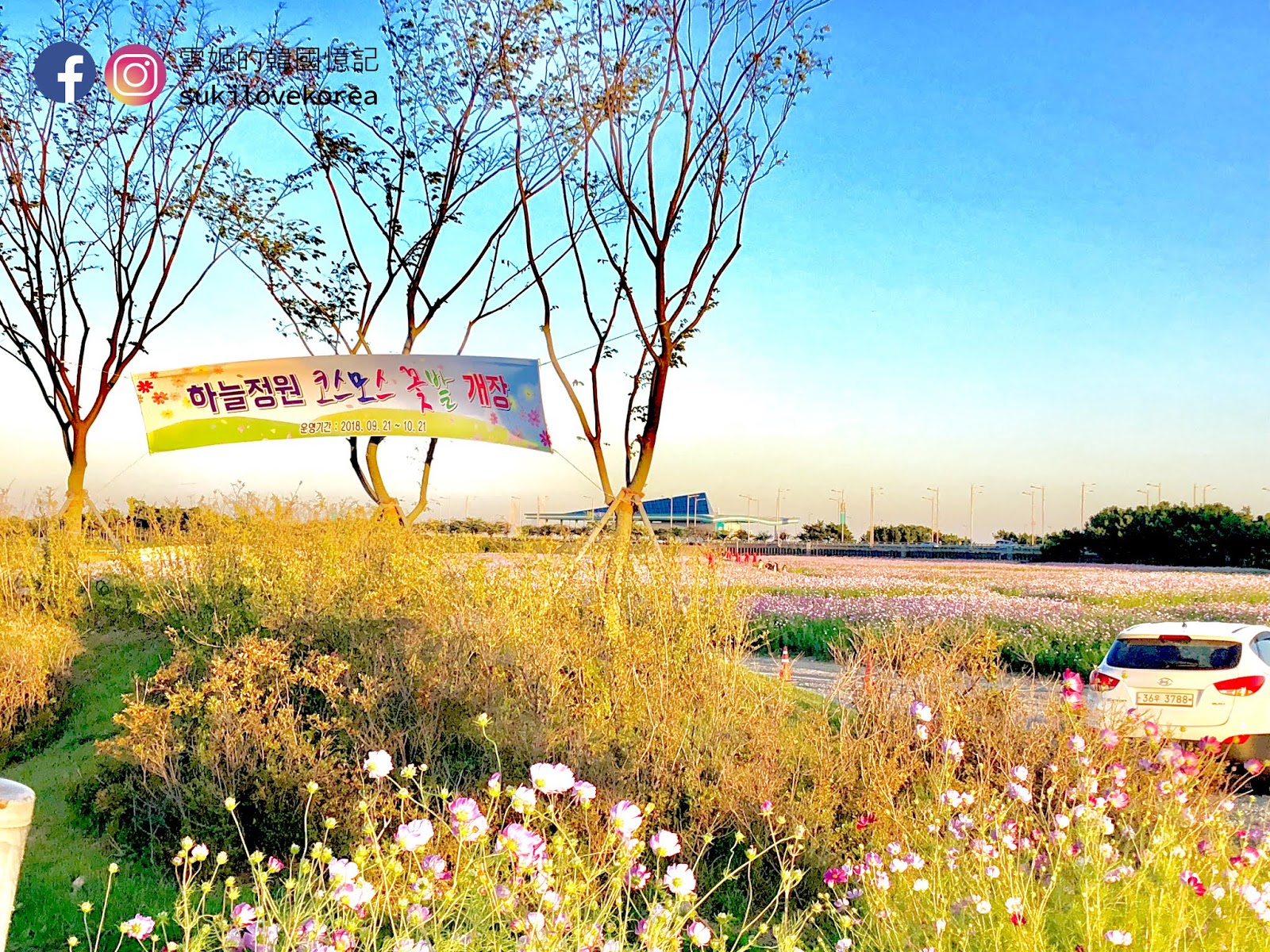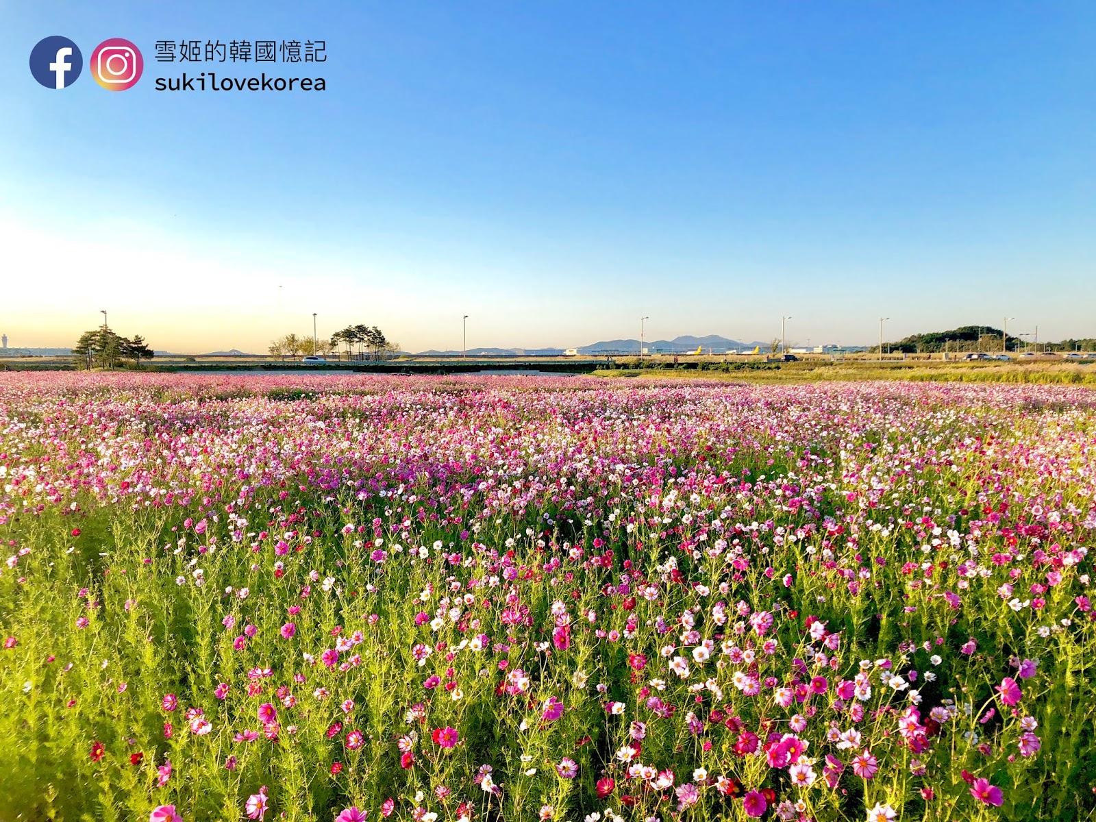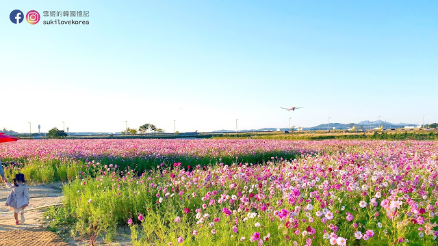 這個波斯菊花海位置就在仁川機場附近,屬於仁川機場的一部份,就在仁川國際機場的天空庭院,大家早機來到仁川一大早沒地方去或夜機離開韓國下午沒地方去,大家不妨考慮來這裡逛逛來這片超大花海打卡打卡。