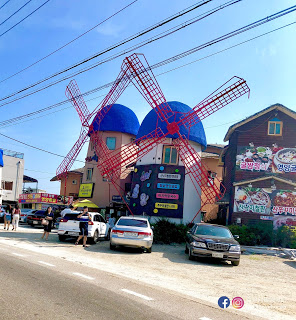 在泥灘咖啡店的上方有幾座以藍色屋頂紅色風車超搶眼的建在大路旁,帶點童畫可愛感!既然到來了不妨在這拍下照也不錯!