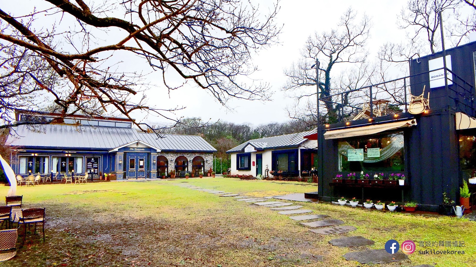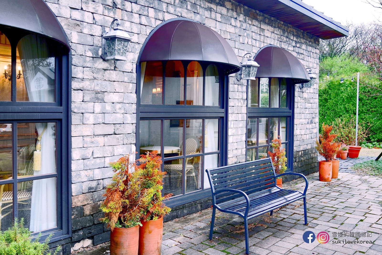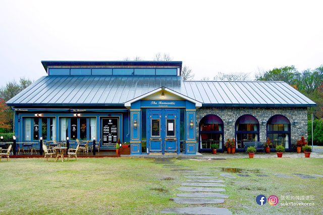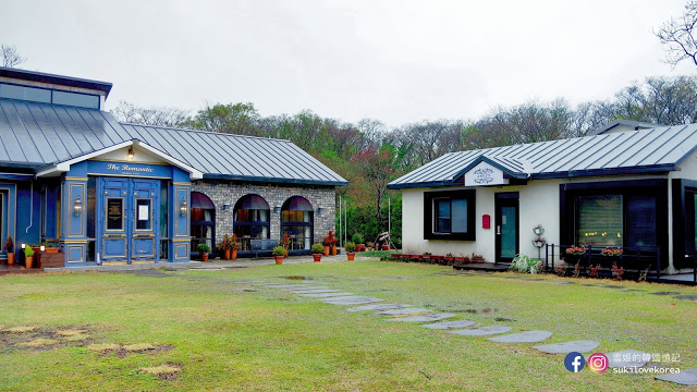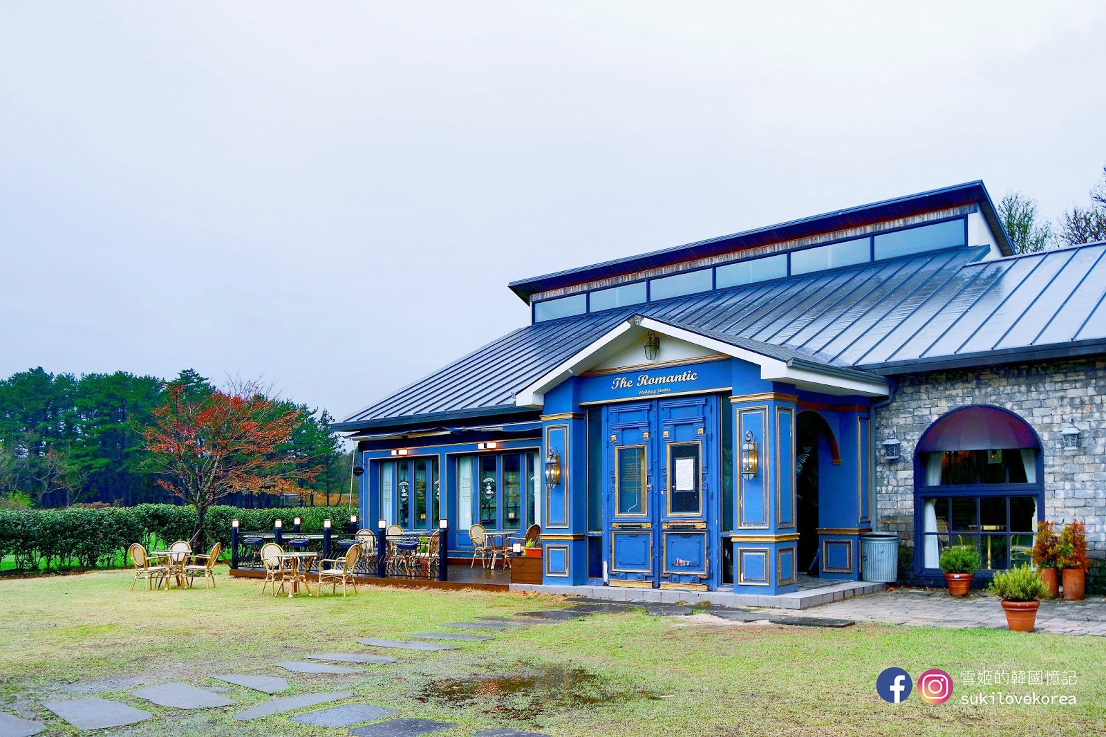 藍色建築物的前方都是有兩棵高聳的大樹,店主刻意掛上歐陸懷舊燈具和纏上白紗作點綴裝飾,加上背景的一大片綠野草皮,難怪這麼多韓國人來這裡自拍婚照啦!