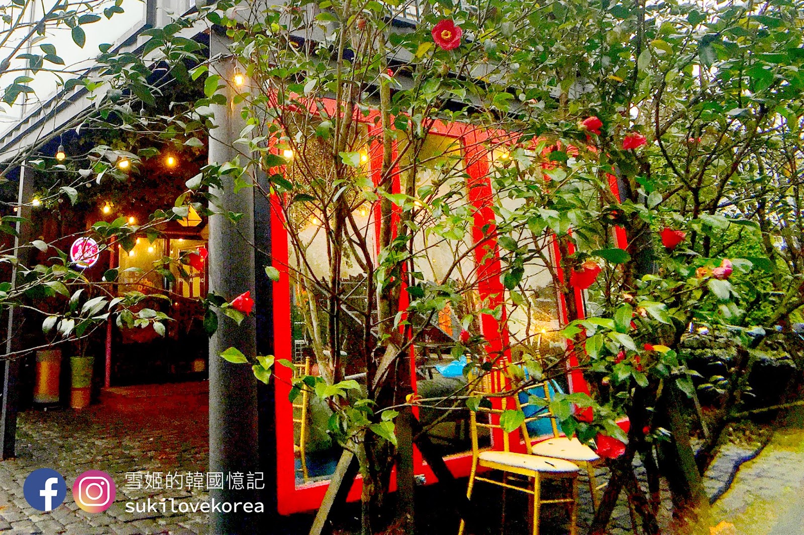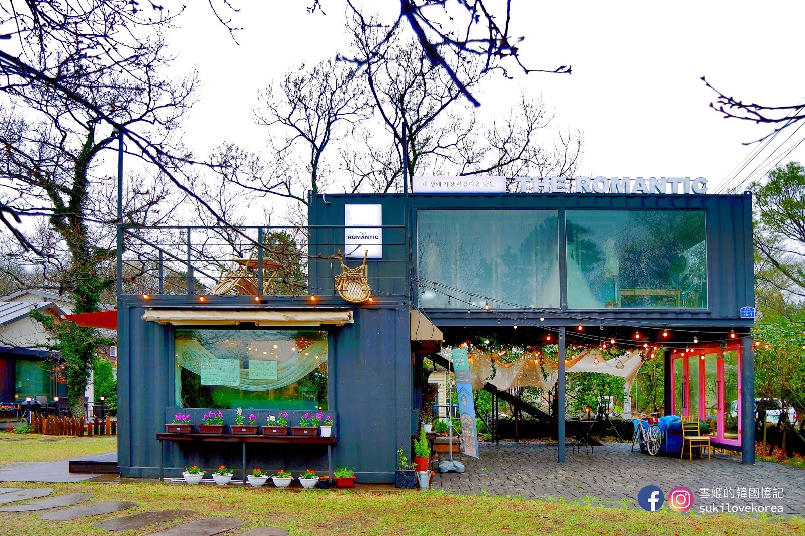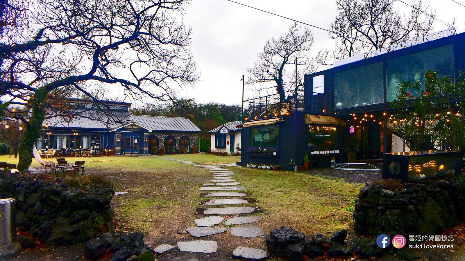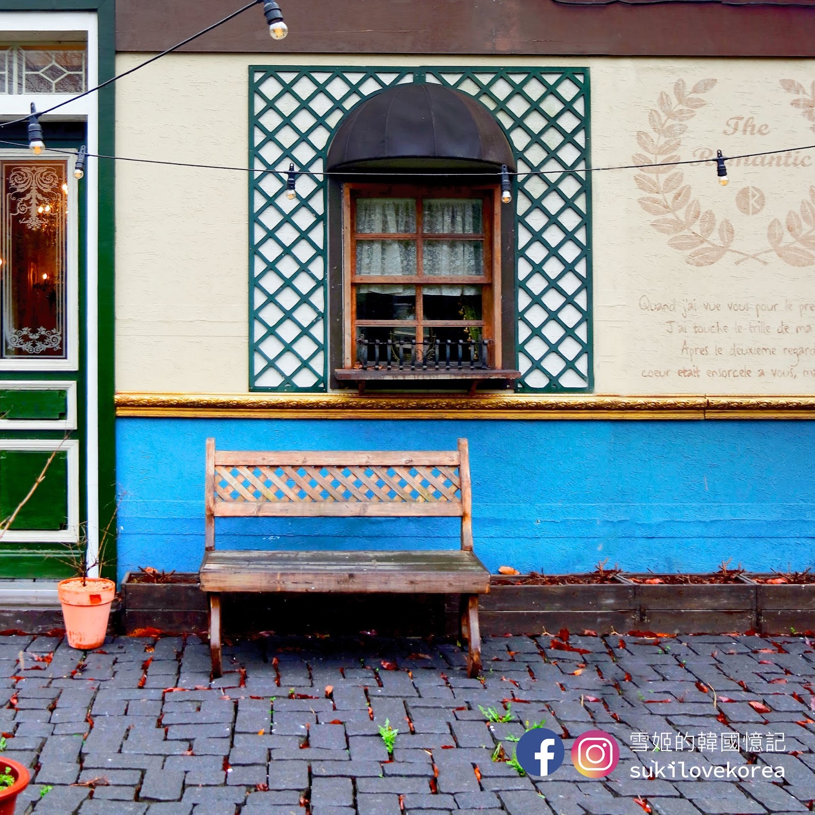 藍色建築物的前方都是有兩棵高聳的大樹,店主刻意掛上歐陸懷舊燈具和纏上白紗作點綴裝飾,加上背景的一大片綠野草皮,難怪這麼多韓國人來這裡自拍婚照啦!