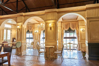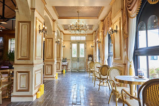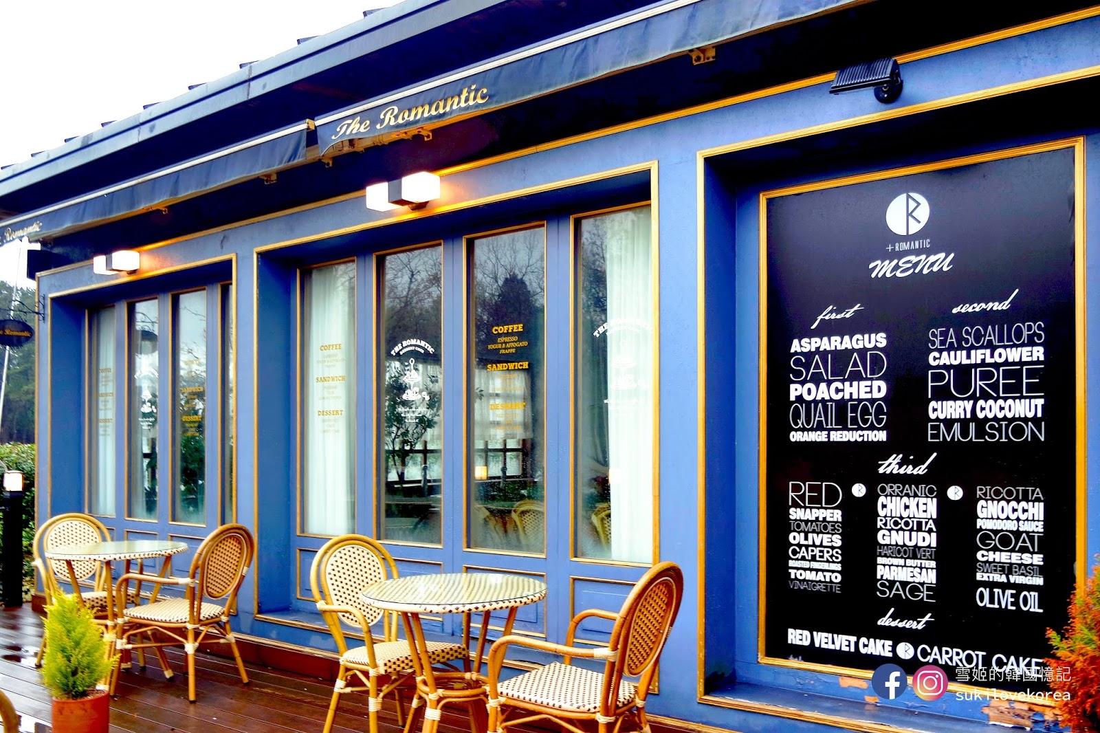 單是外圍都已經能謀殺不少記憶體了,在藍色建築的正門左前方擺放置悠閒舒適的藤製椅桌配會長形玻璃窗戶,藍金色的外牆及裝飾線條,歐洲貴氣味極濃。