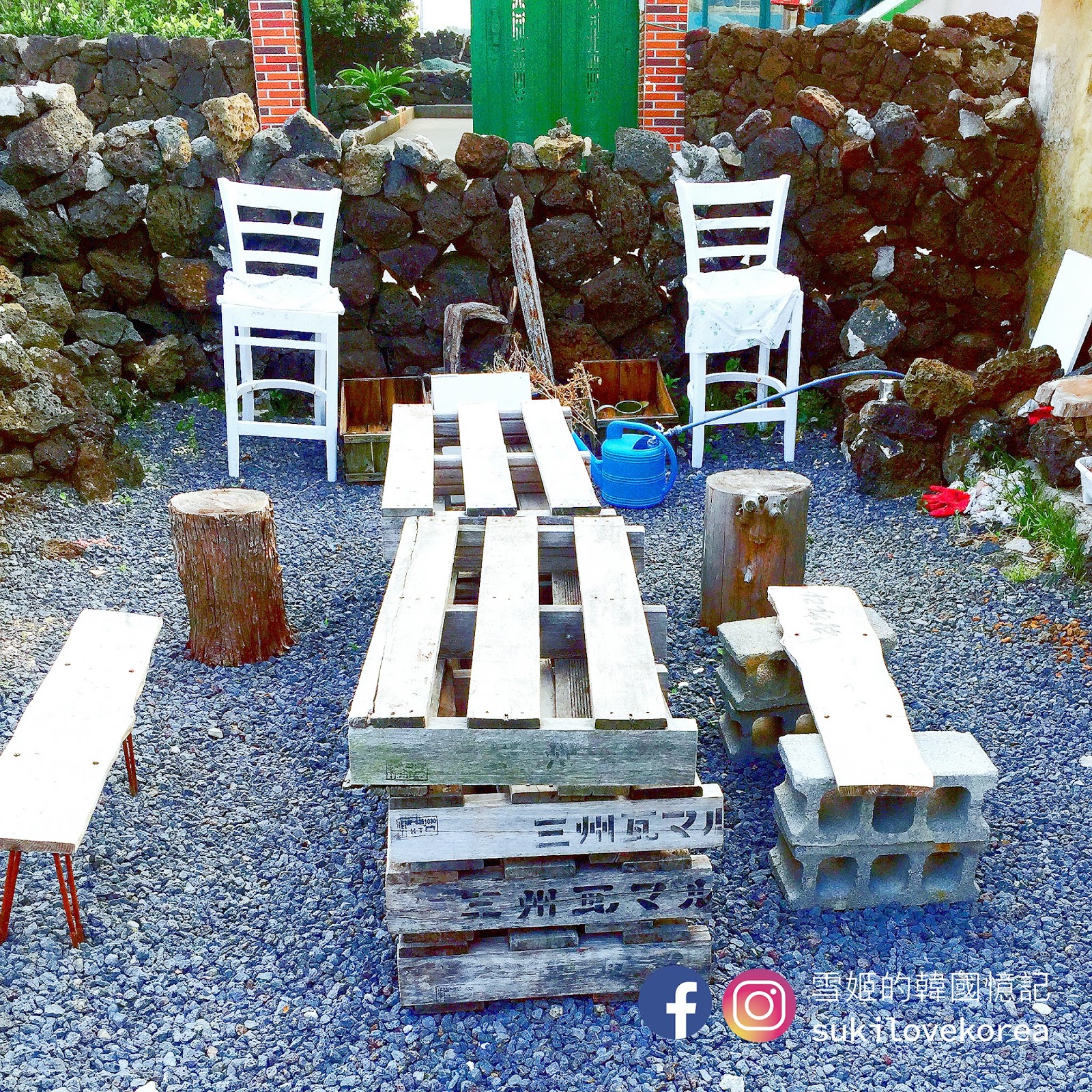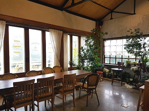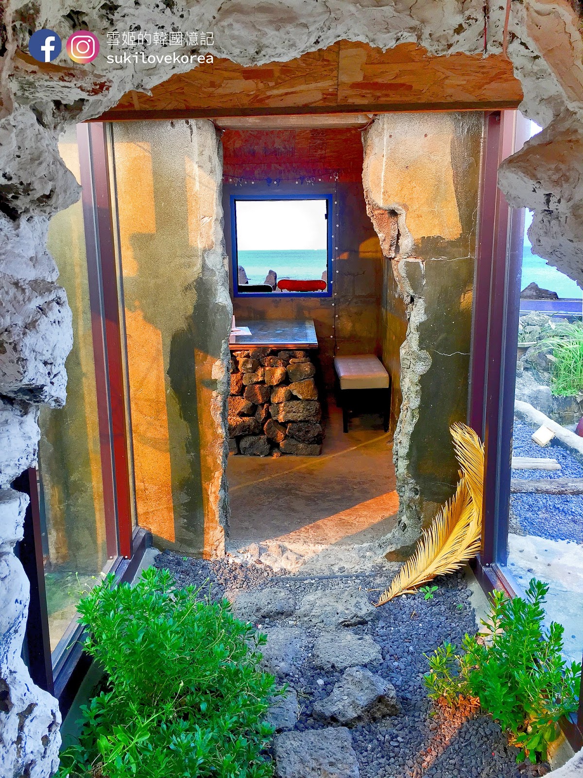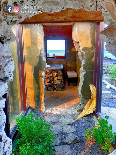剛剛提及過,店主用其傻瓜想法把店中大部分會阻礙看海的牆壁都掉了,令大部份的牆都穿了一個大洞,但經店主的一翻用心佈置,植物的擺放,石頭木材桌椅和落地大玻璃門窗的配搭,令整個玻爛的空虛一下子就變得有個性之餘又更能感受大自然氣息。當然。。。店主的用心,令整個空間的每寸角落都成為了韓妹美拍的背景,這裡又是一間零死角的美拍咖啡店啊!在濟州只拍咖啡店背景都會忙到不行!