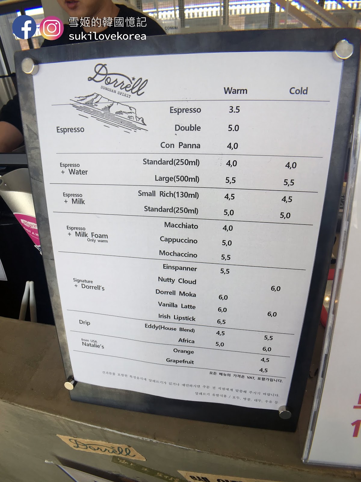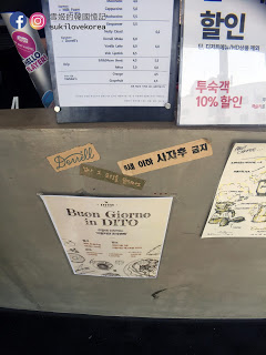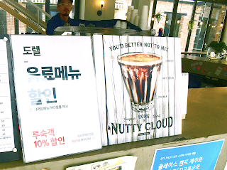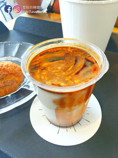 面層是溫暖的細膩expresso,中層是細滑而香濃的堅果味奶油,底層剛是冰凍的牛奶。。。喝一口就能感覺到多種不同的口感在口腔中結合成一種獨特而回味的咖啡!但是這款咖啡售價蠻高6000won只得一小杯~~~我們看到實物都嘩。。。好貴啊!