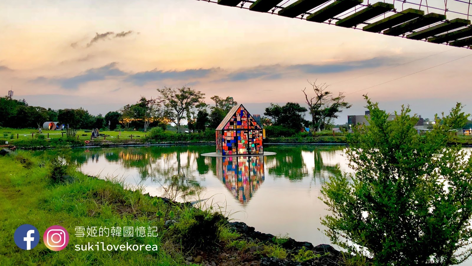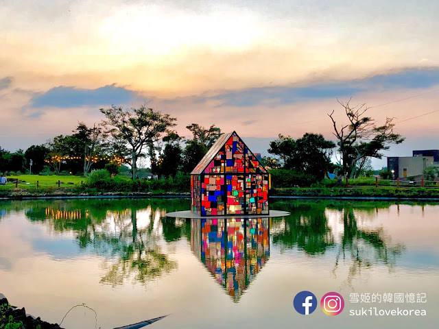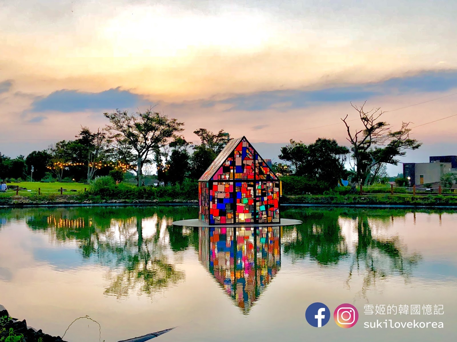 在濟州茶喜然的燈光藝術慶典最特別的是湖中的彩色琉璃房子,當房子的燈亮著了彩色的方塊就會像歐式教堂的彩繪玻璃窗口般。