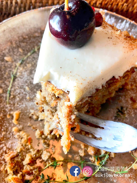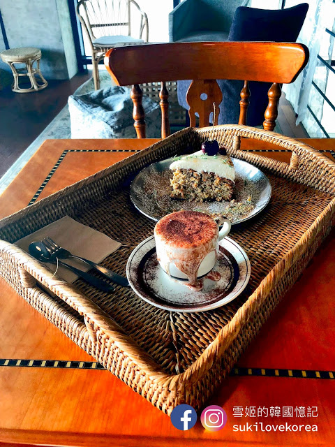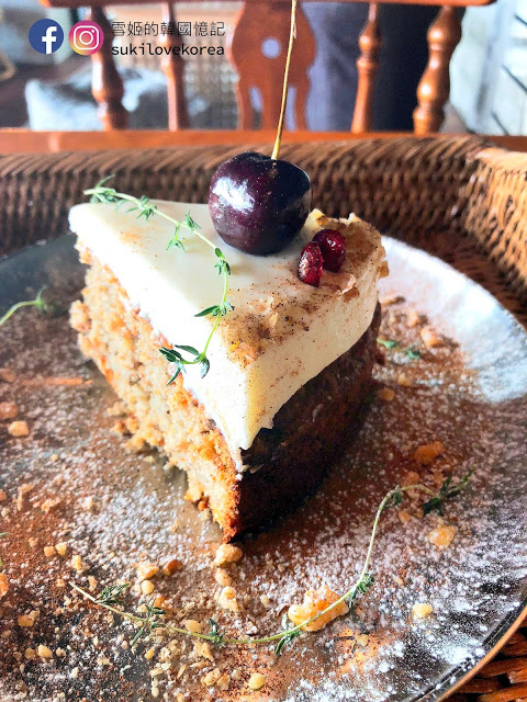 而甜點方面在濟州怎能不吃濟州出名的胡蘿蔔蛋糕,蛋糕內充滿著一絲絲的胡蘿蔔條,口感非常豐富而味道又不會過甜,而且蛋糕伴碟也會弄得美美的,方便大家相機先吃啊!*留意此咖啡店是規定了每位客人必須點一杯飲料!