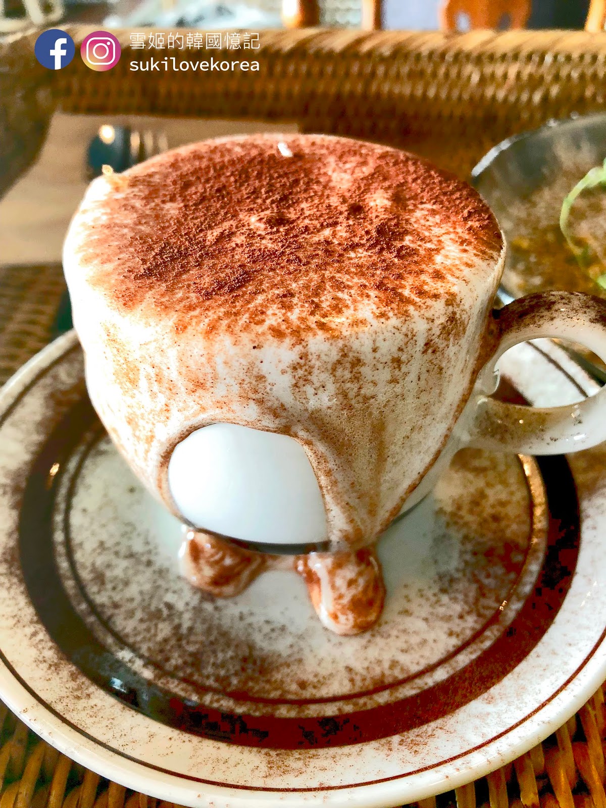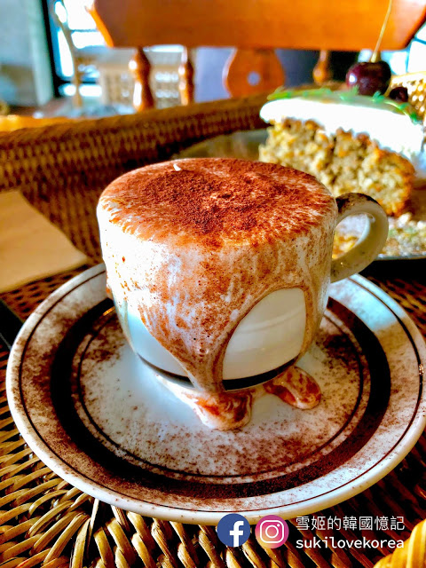 說回髒髒的咖啡大家只要點 아인슈페너 / einspanner (維也納咖啡),黑咖啡上擠上了滿瀉的厚厚鮮奶油,鮮奶油上洒上可可粉,甜甜的鮮奶油混合黑咖啡來喝甜中帶點苦澀的濃郁感。
